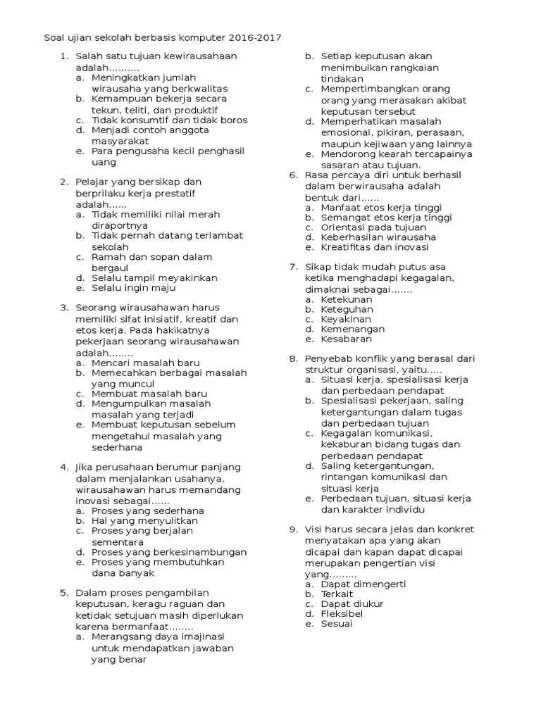 Soal ujian akhir sekolah tahun pelajaran 2005 / 2006. Pilihlah salah satu jawaban yang paling tepat 1. Ujian dilaksanakan di smk untuk tahun pelajaran 2016/2017 terdiri dari,. 20 tahun 2016 tentang standar kompetensi lulusan. Dasar dan menengah tahun pelajaran.
